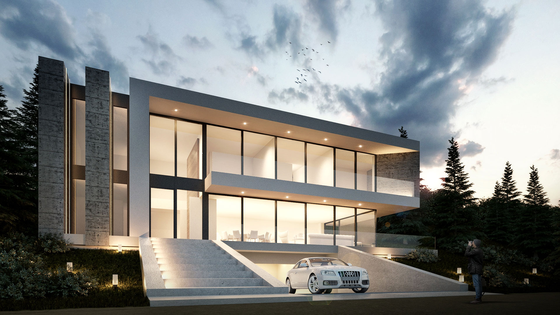 The design implements cantilevers and strong horizontal plans to maintain the view toward the lake.